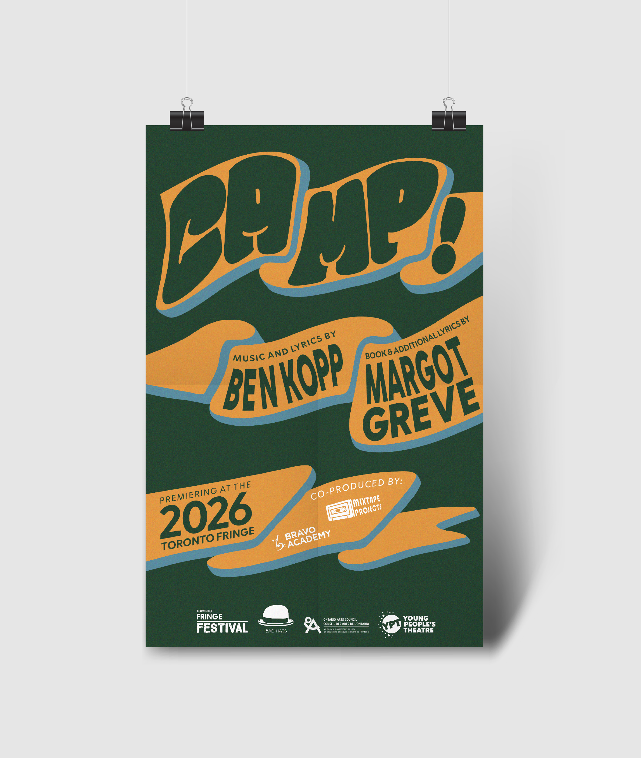 Camp! is a musical written and directed by Ben Kopp and Margot Greve. I have designed several posters for their shows in the past. I’m incredibly proud of the work I continue to do with them, especially this one. I worked hard on coming up with the concept for this design, and went through several ideas before I finally landed on the one you see below. The colour pallet was provided to me to match the show’s aesthetic.